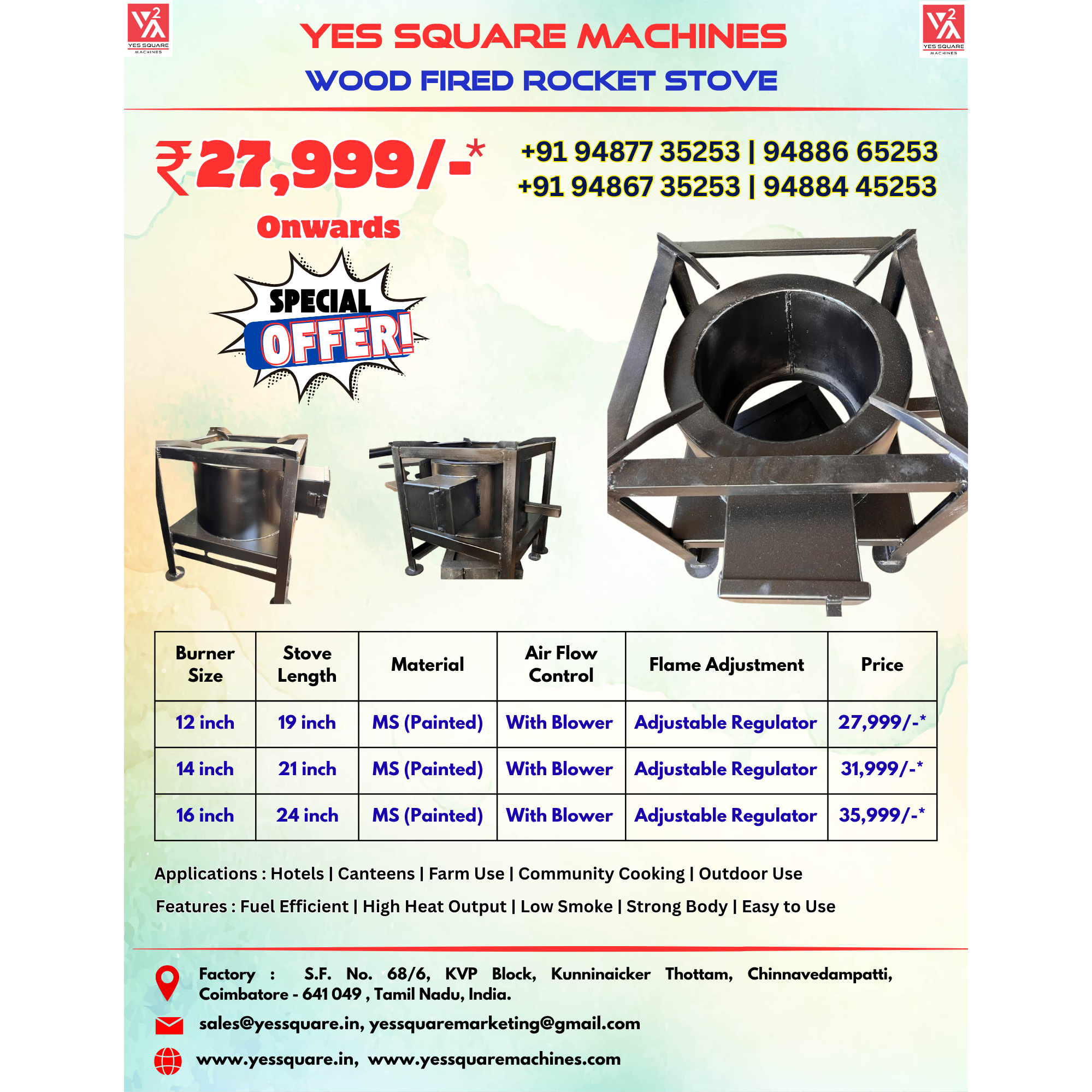 Built with a heavy-duty mild steel (MS) painted body, the rocket stove ensures durability and long life. It comes with a blower system for better air flow and improved combustion, giving higher heat output with less firewood. The adjustable regulator allows easy flame control as per your cooking needs.