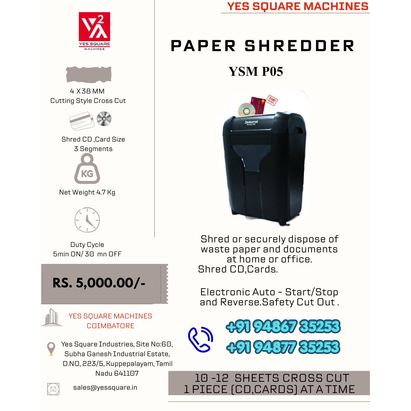 Yes Square Paper Shredder shred or securely dispose of waste paper and documents at home or office.